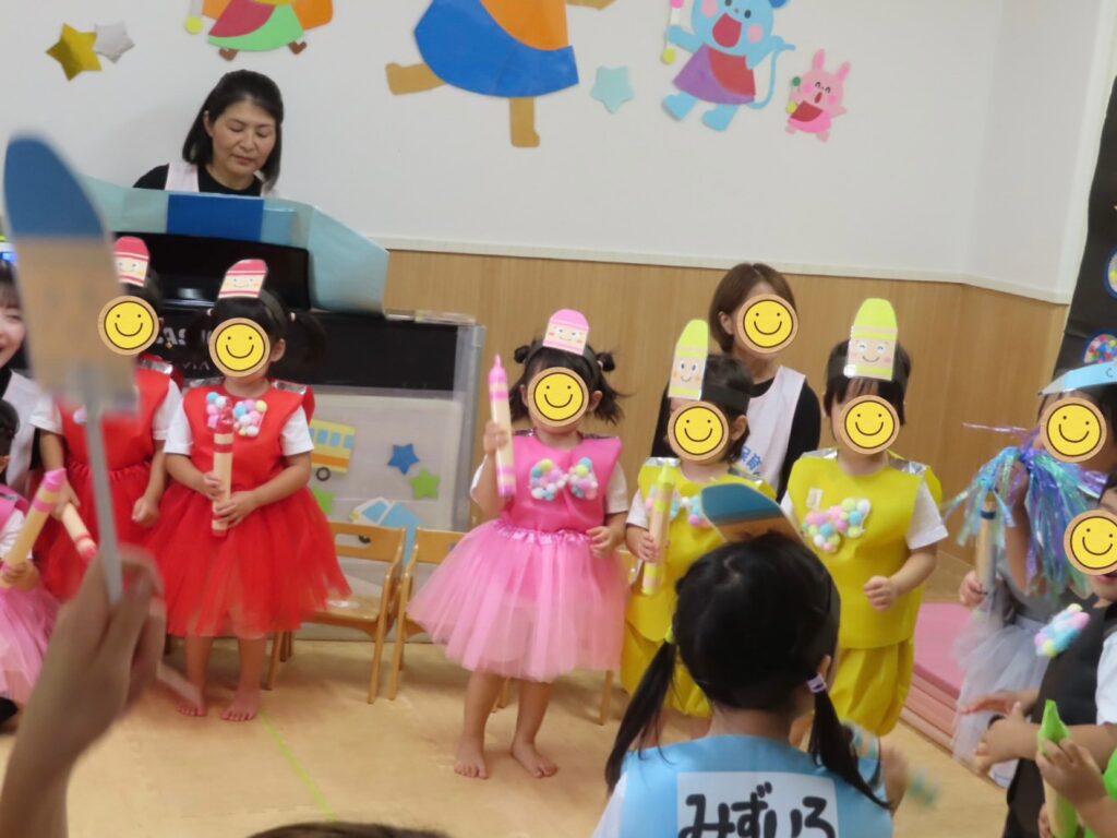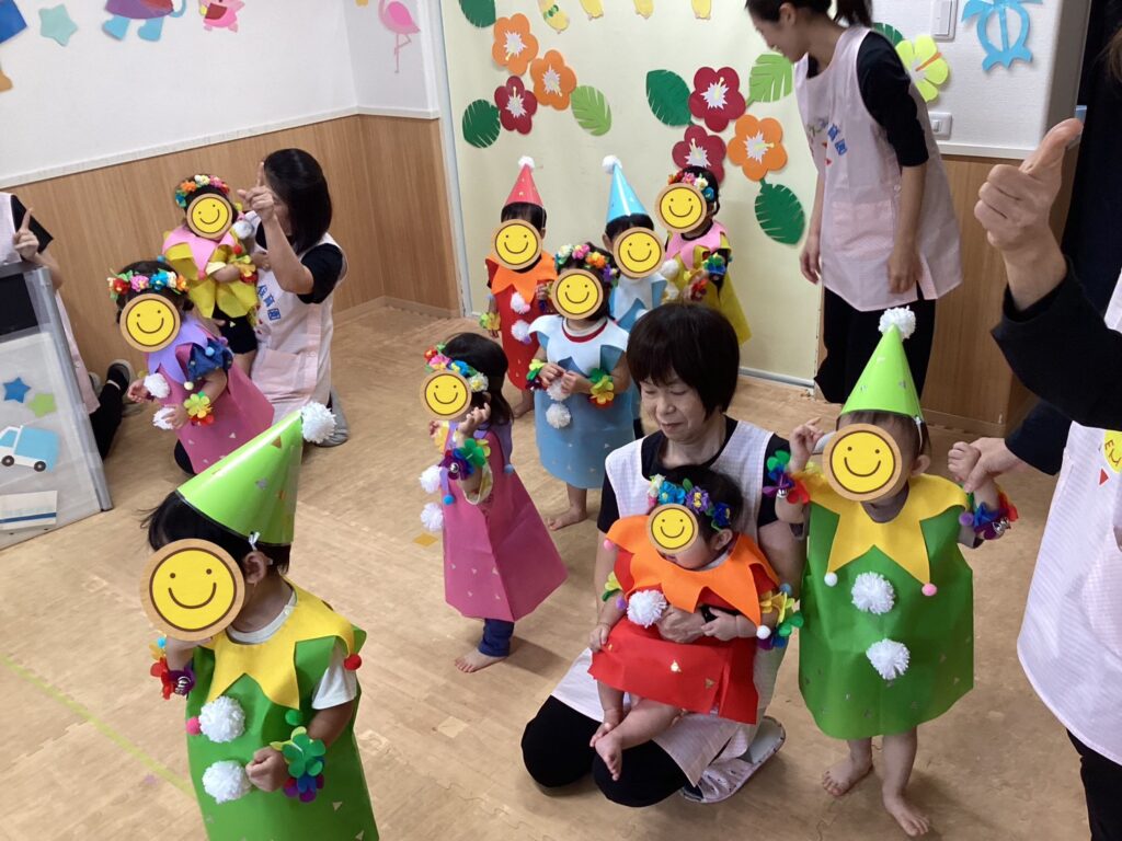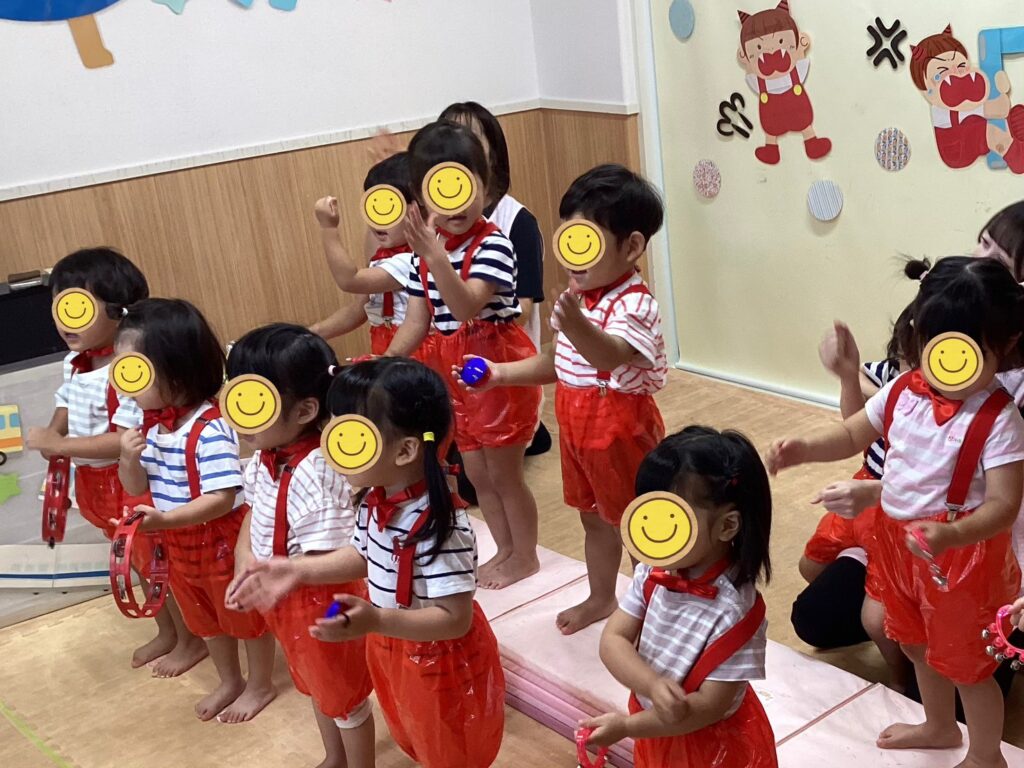 「わたしおおきくなるんだもん。ぶー😙」と口を尖らせおしりを突き出す姿は、にこちゃんそのもので、おうちの方も保育士も皆んな笑顔になっていました✨楽器も何度も練習して、本番ではしっかりリズムをとりながら演奏してくれましたよ🎶