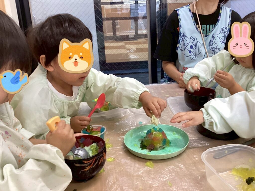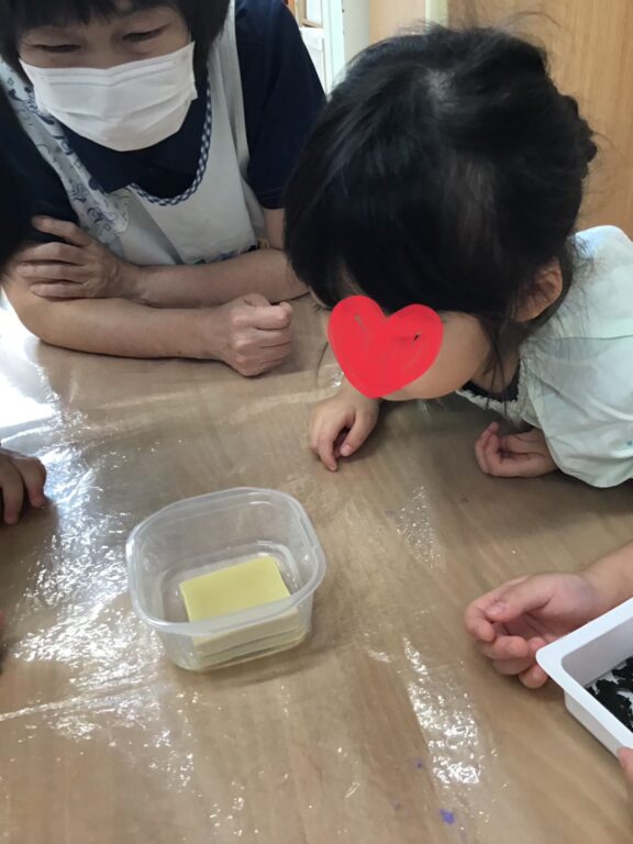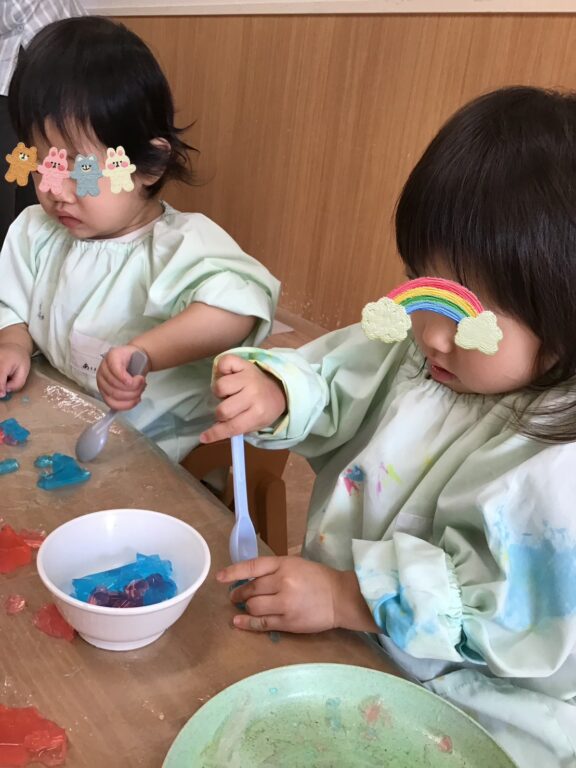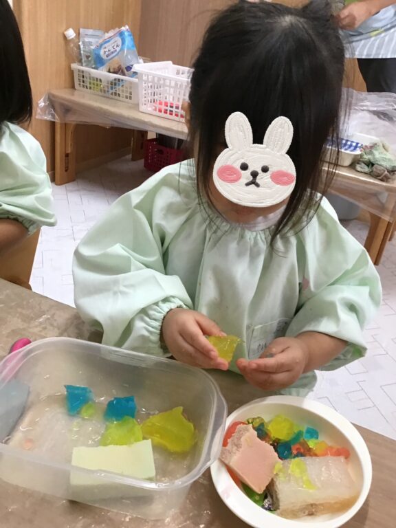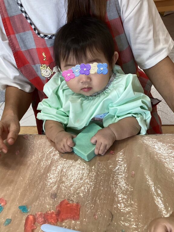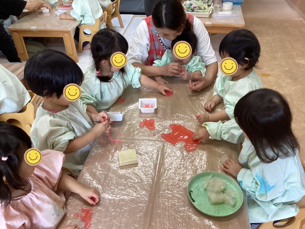 乾いた状態では難しいようでしたが、正解を聞くと「たべたことあるー✨」「わかめ、おつゆにはいってるで😆」と次第に興味を持ち始め、皆んな匂いを嗅いだり、つまんだりしながら感触遊びを楽しみ始めました💓