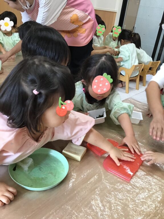 水につけておくと乾いているときとはまるで違う手ざわりに、「つるつる!」「気持ちいい~!」と夢中で遊び続けていました🎶