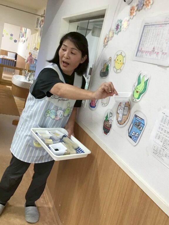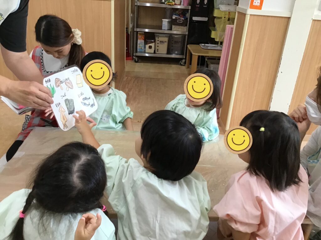 最初に「乾物」の絵を見ながら「皆んなも食べた事あるよ、何かわかるかな?」と質問すると「なんだろう🤔」と一生懸命考える子どもたち🥰
