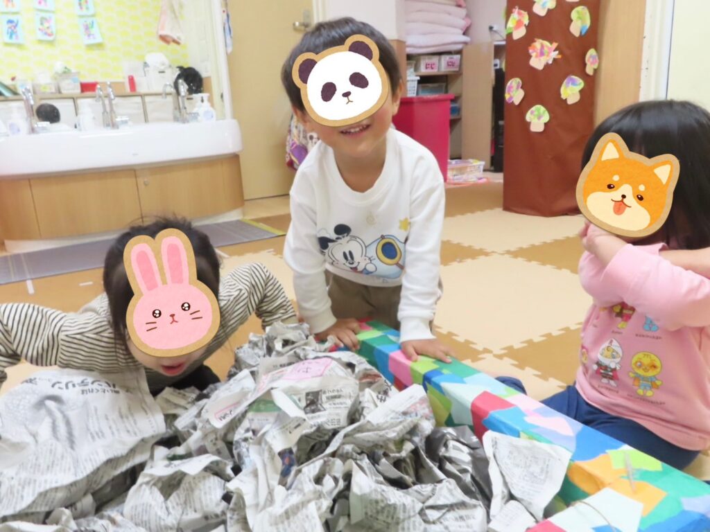 さらに、以前に作っておいたさつまいもは新聞紙の畑の中にかくして「うんとこしょ、どっこいしょ!」と力いっぱいひっぱり出し、まるで本物のいも掘りのようでした🍠