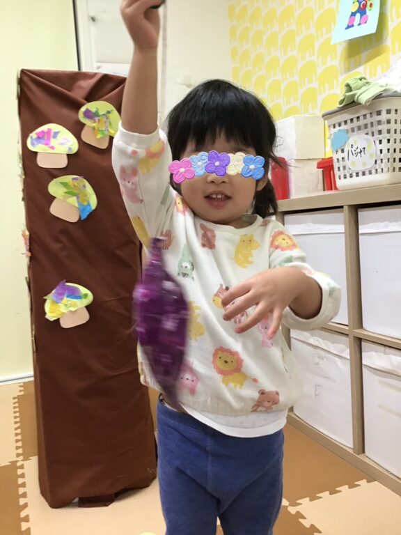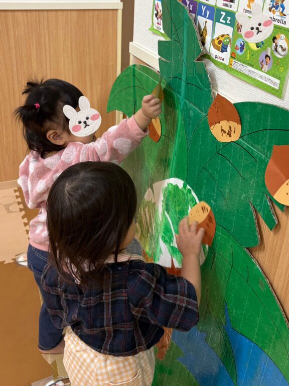 木に貼りつけた栗やきのこも、両手を伸ばして一生けんめい収穫🌰🍄