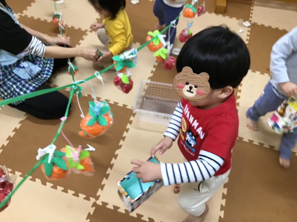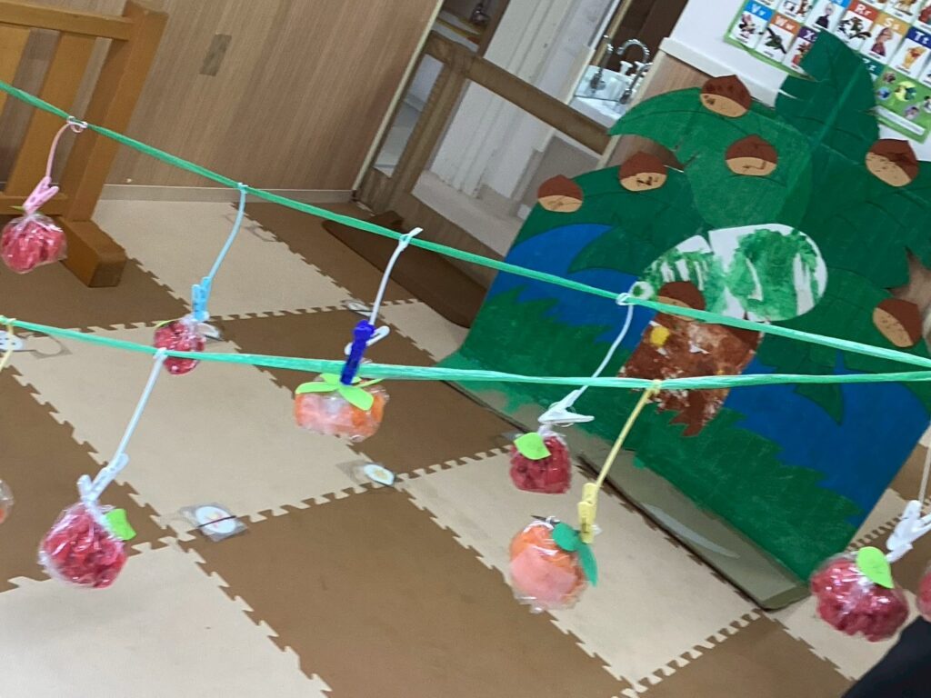 先日お部屋で“味覚狩りごっこ”をしました🌟 本来は柿狩りに出かける予定でしたが、今回は安全を考慮して園内で行いました🌾