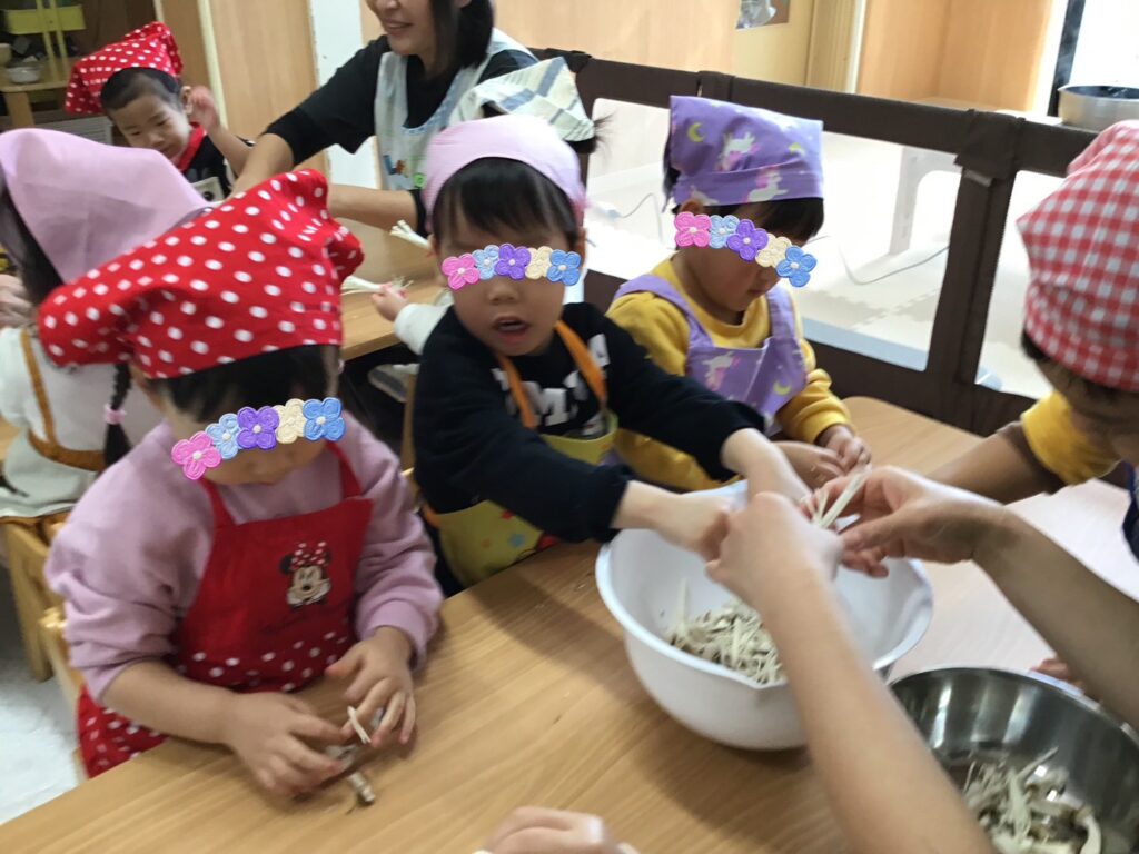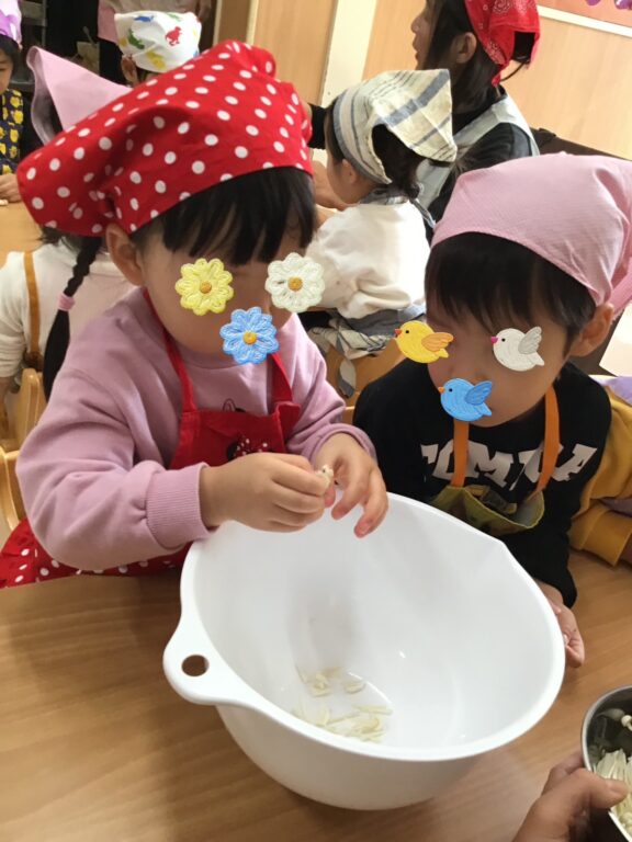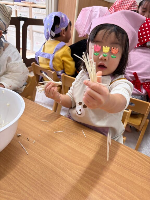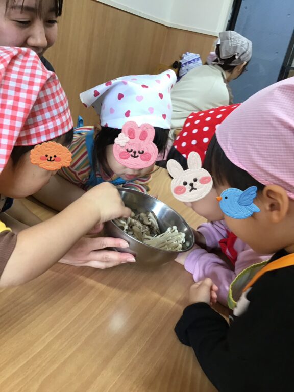 そのあとのきのこ割きでは、きのこを丁寧に一本ずつ割いたり、豪快にポンっとボウルに入れたり🤣どの子もとても楽しそうに取り組んでいましたよ🍄✨