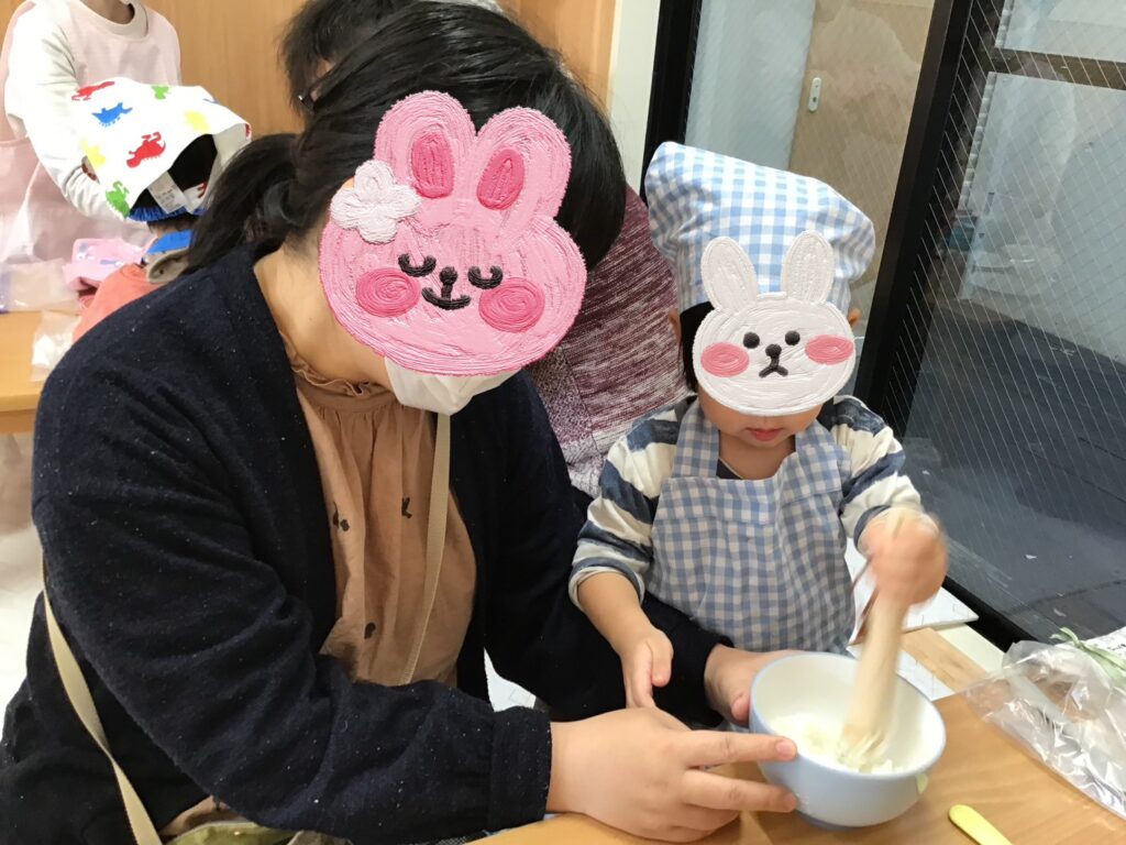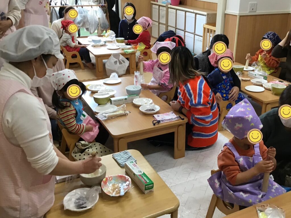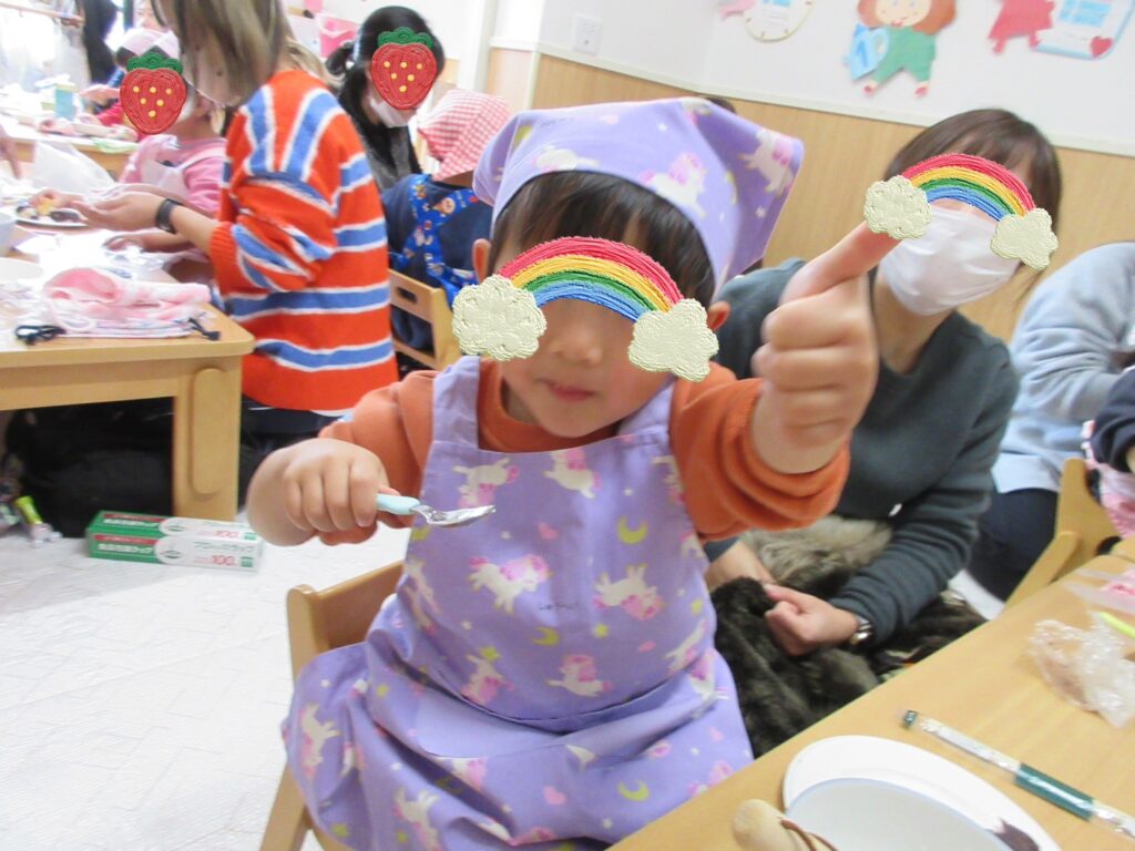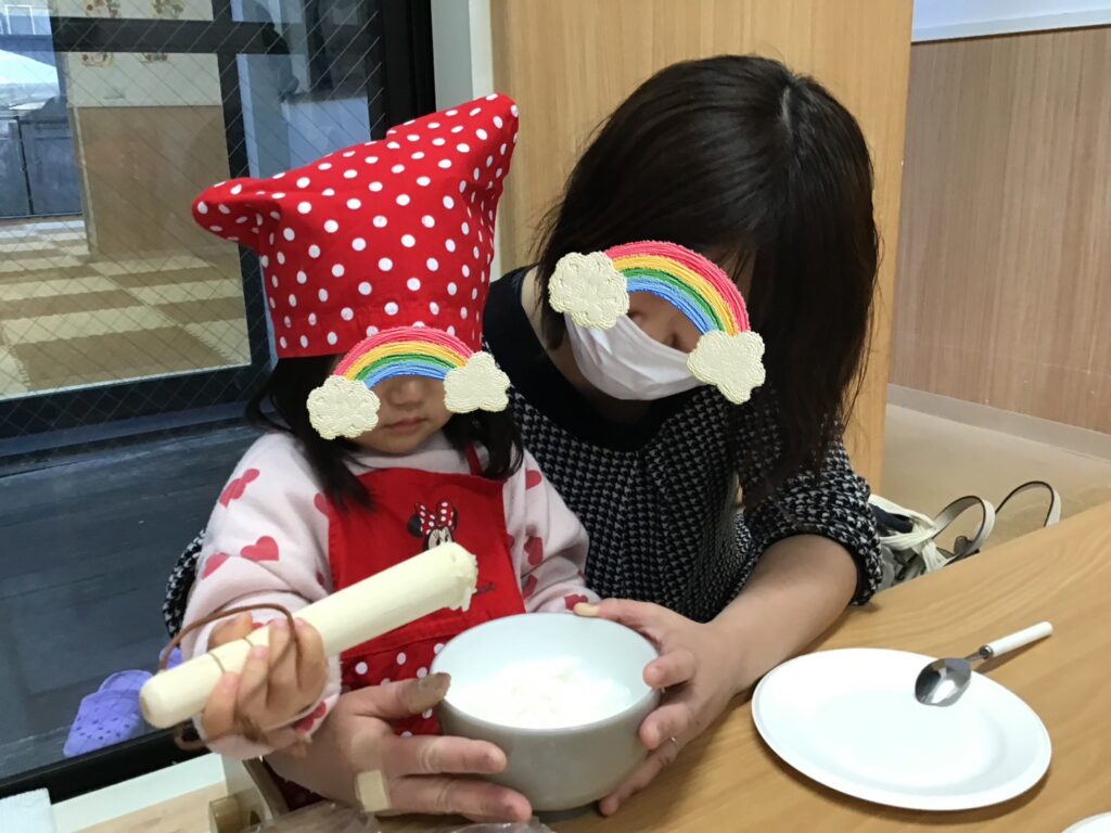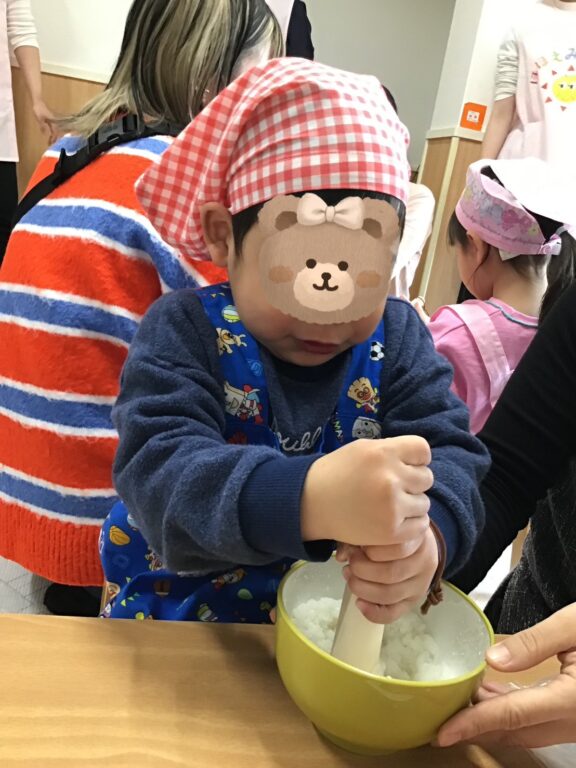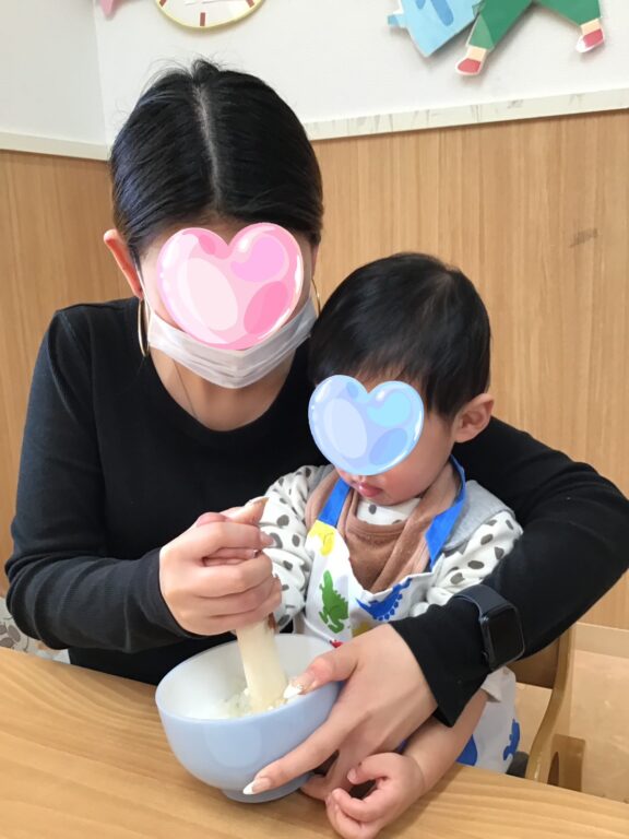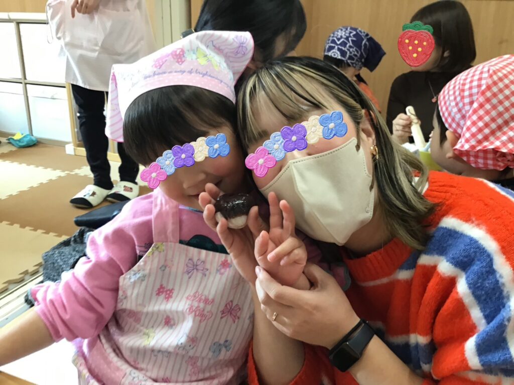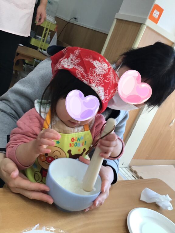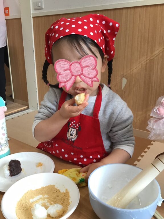 あんこやきな粉を先に味見してしまう子や、保護者の方に「あーん」と食べさせてあげる微笑ましい姿も見られ、みんなとても楽しみながら取り組むことができました♪