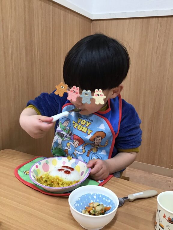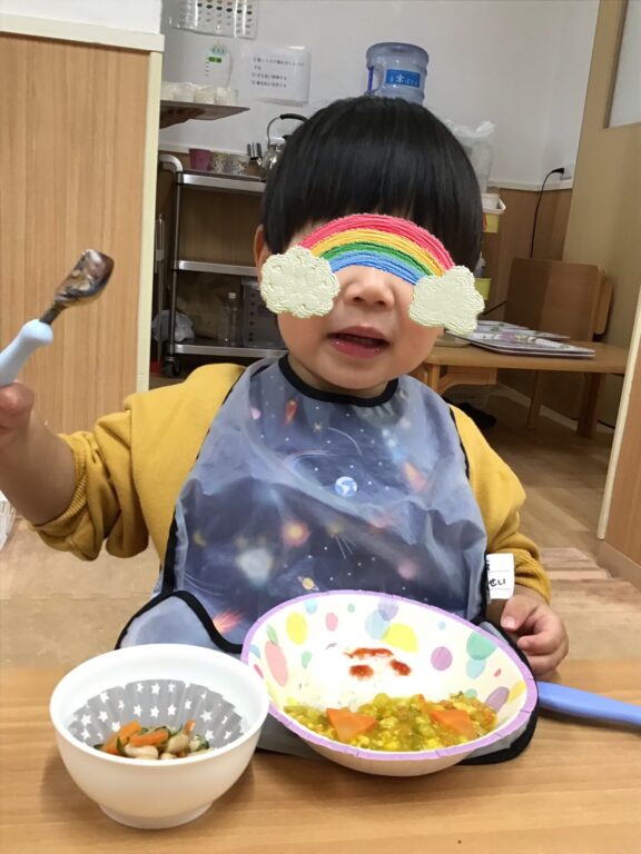 給食は、節分にちなんだ「鬼さんカレー」と「豆サラダ」🥗🍛