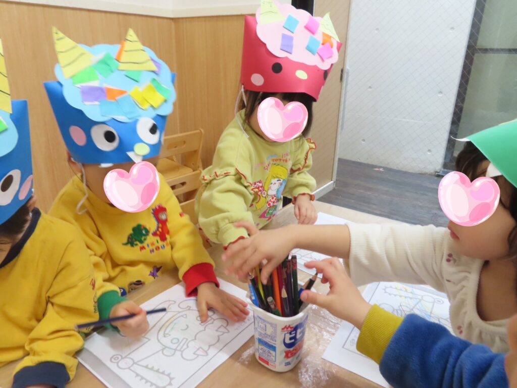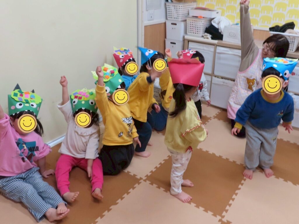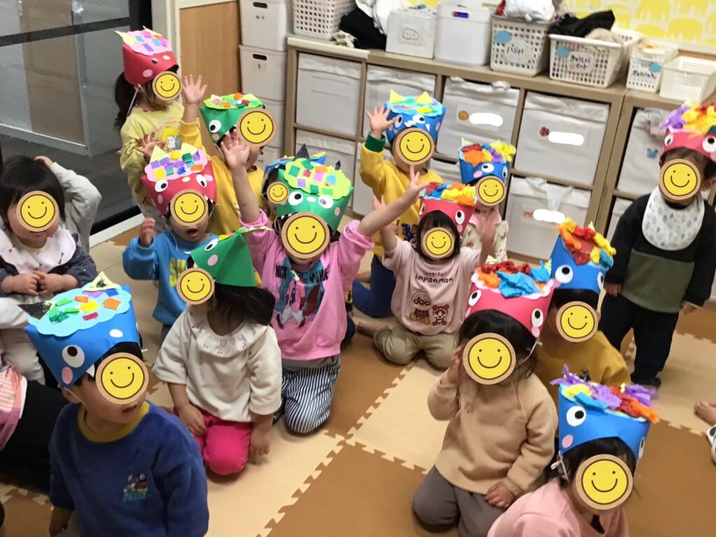 子どもたちは、自分たちで作った鬼の帽子をかぶって、鬼の絵本を読んだり、保育士から節分のお話を聞いたりしました📖✨
