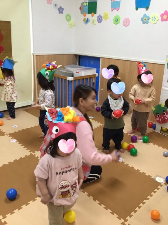 壁に貼った鬼やダンボールで作った鬼に向かって、「鬼は〜そと❗️福は〜うち❗️」と元気いっぱいボールを投げました😆