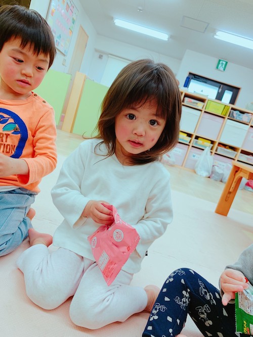 おやつ🍬の時間では、「どんなおやつ持ってきたの?」と聞くと「これ持ってきたよ~!」と嬉しそうな子どもたち!「どうぞ~🤗💕」と友達や保育士とおやつを交換したりと楽しい時間を過ごしました