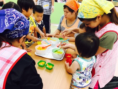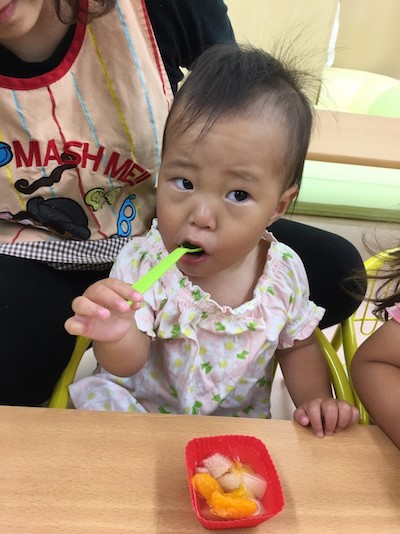 みかんだけをカップからあふれる程入れるお友達や、全部少しずつ入れるお友達、中にはついつい、つまみ食いしてるお友達と様々で、美味しいゼリーが完成しました💓