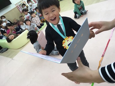 卒園証書と、卒園記念のメダル🏅やお皿を貰いニコニコのこどもたち😊✨