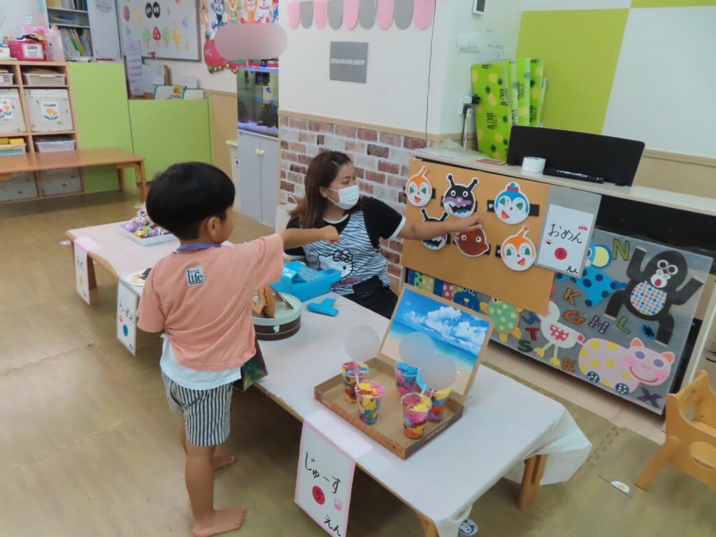そして、1人ずつこれ下さいと上手に買い物してくれましたよ👏アメは黄色い1円玉、ラーメンは青い10玉など自分たちでお財布の中から同じ色のお金を出してしっかり払うことも出来ました💰