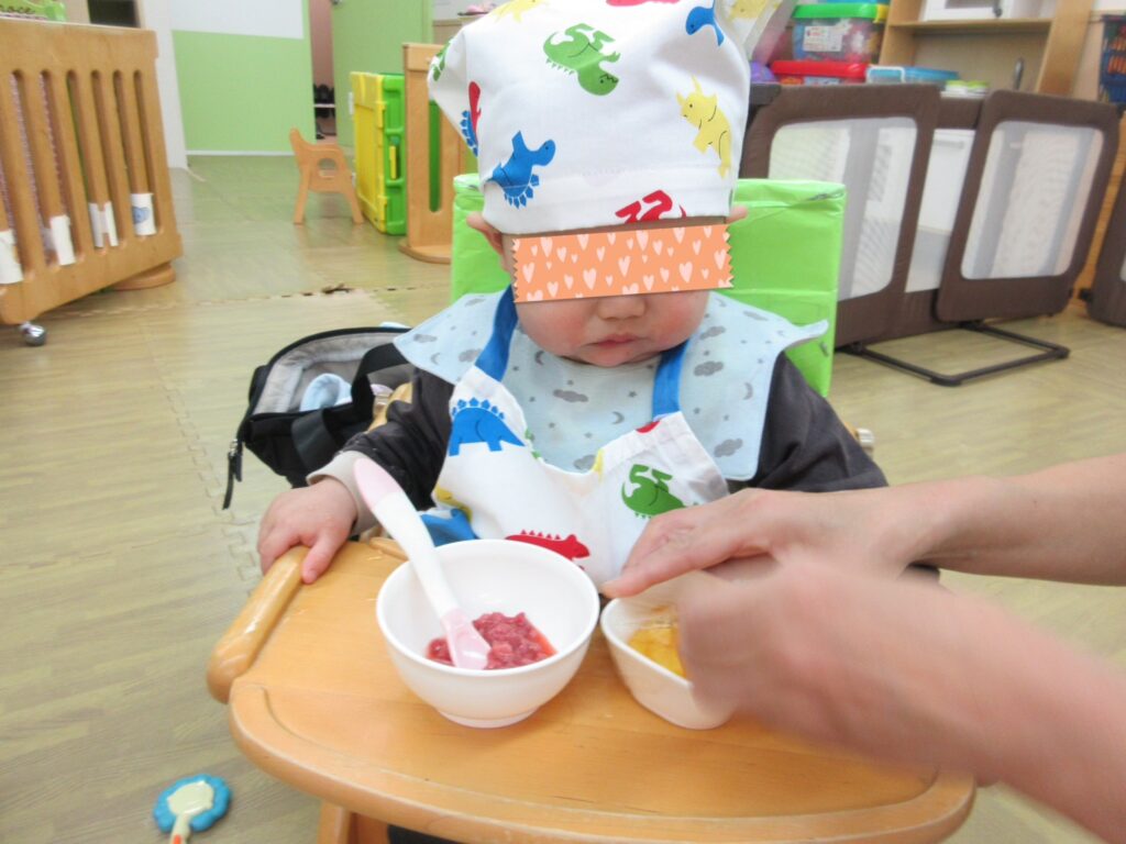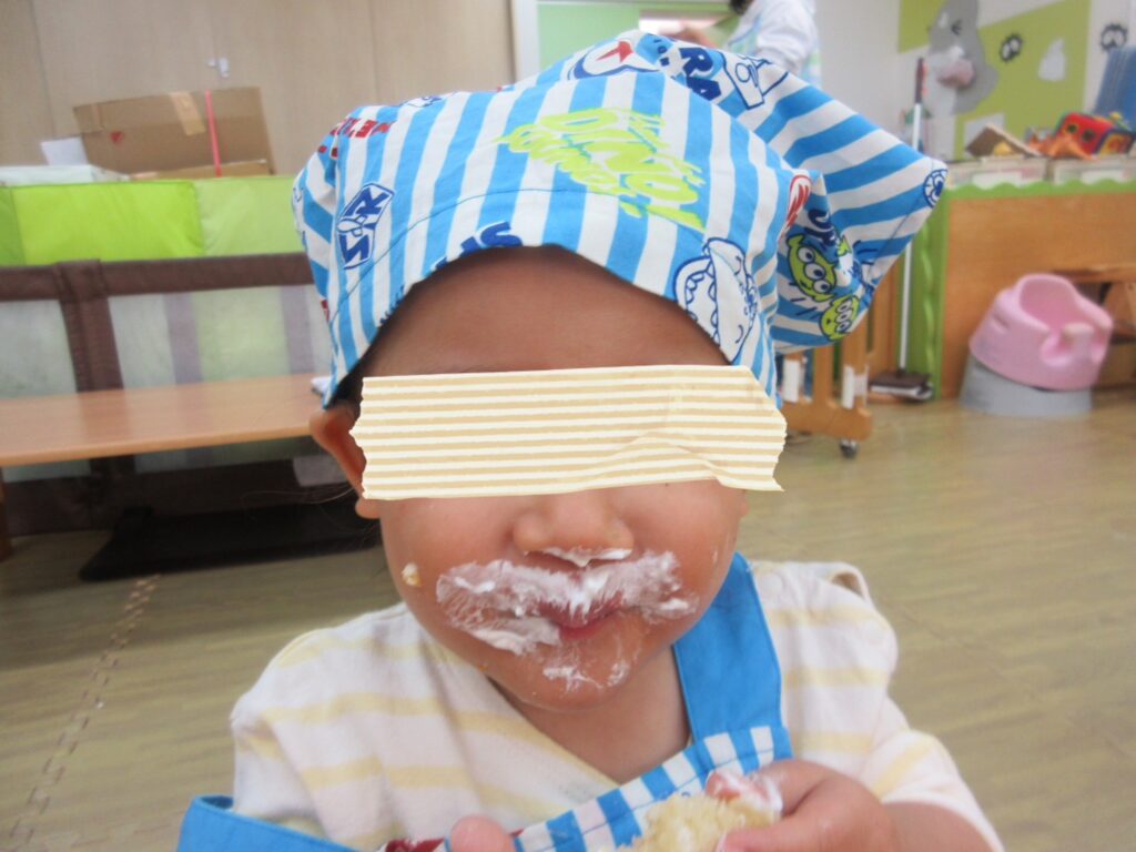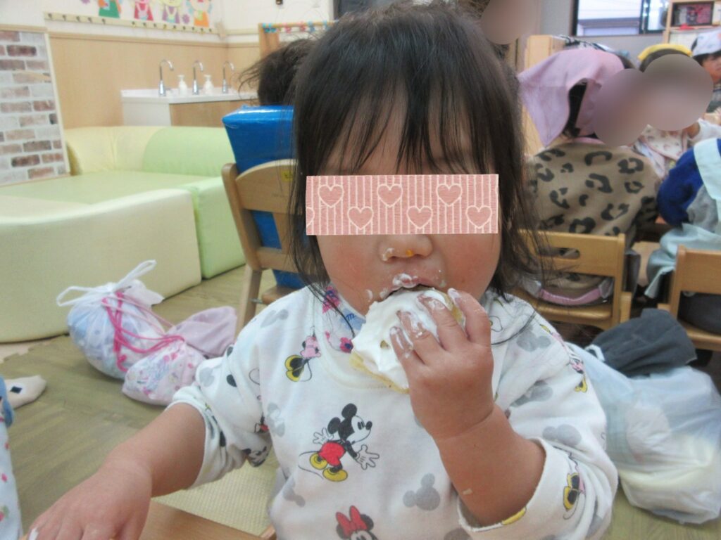 0.1歳児さんはクリームがついているスポンジを用意し、果物を乗せてみたり、そのままスポンジを食べてみたり、クリームだけ舐めてみたりとそれぞれのペースでケーキ作りを楽しみました☺️