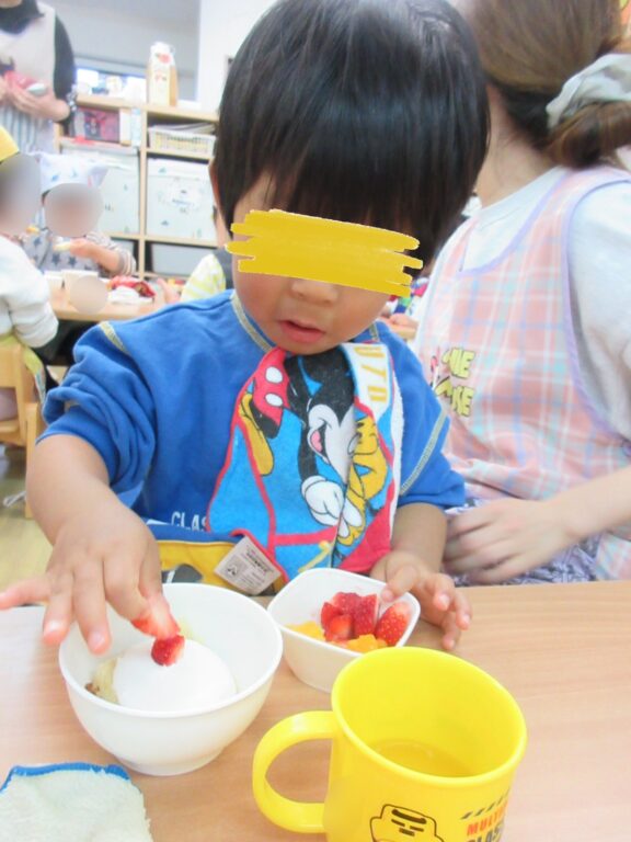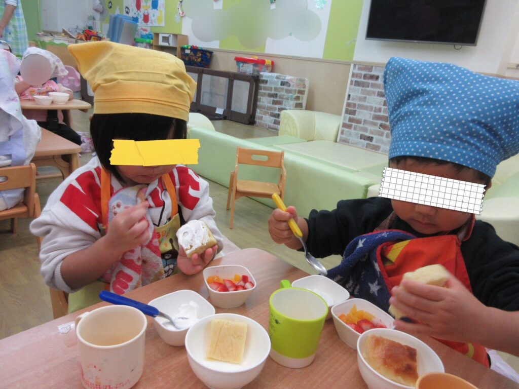 果物が大好きな子は、果物だけをパクっと食べており、みんなとても楽しんでケーキ作りを行っていましたよ🎶