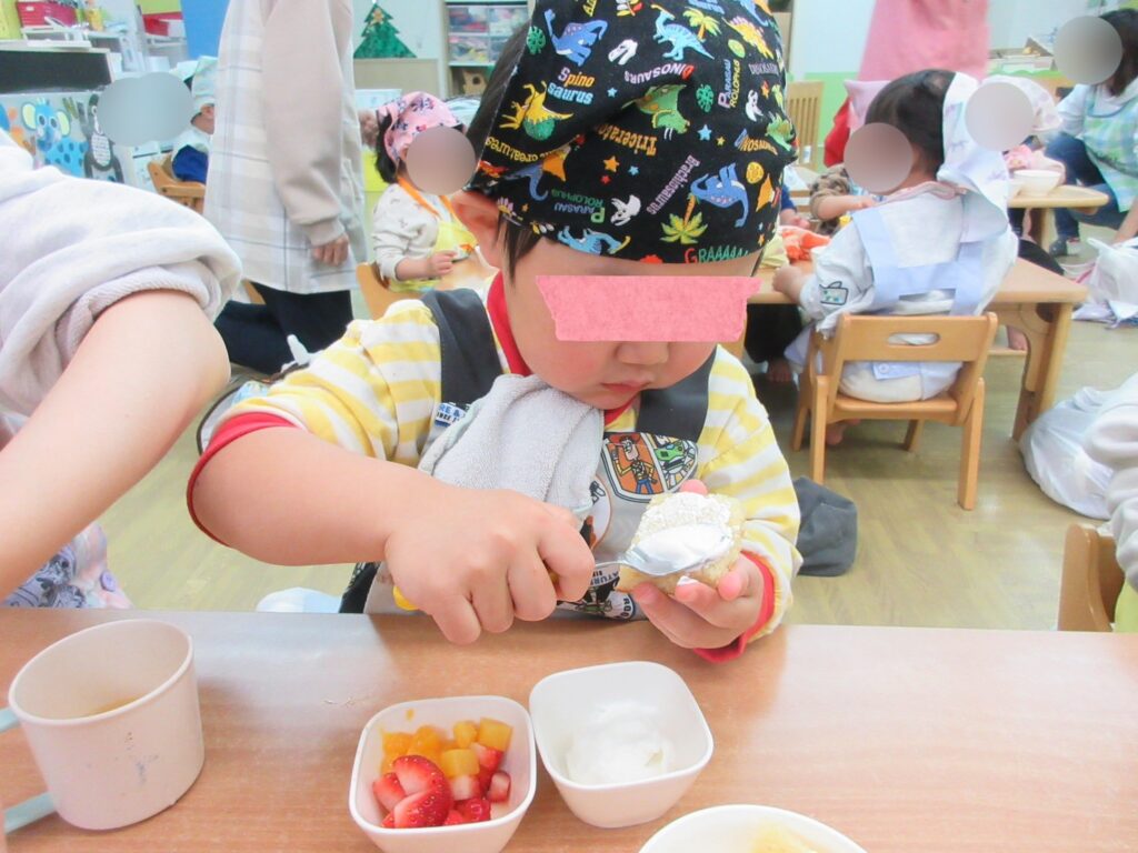 2歳児さんは自分たちでスポンジにクリームを塗る工程に挑戦し、楽しそうに取り組む姿が見られましたよ✨️
