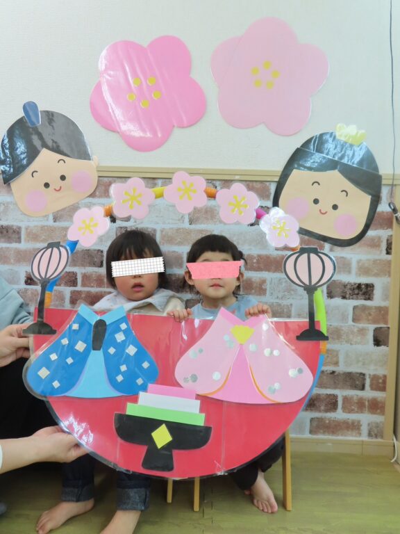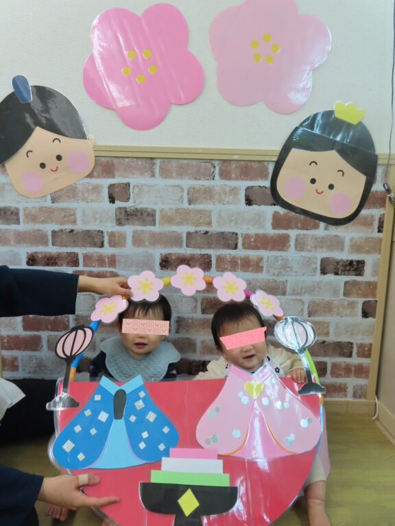 お雛様やお内裏様の衣装の顔はめパネルに顔をはめて、素敵に大変身✨️ちょっぴりドキドキしながらもにこにこ笑顔のかわいいお雛様、お内裏様がたくさん誕生しました♡