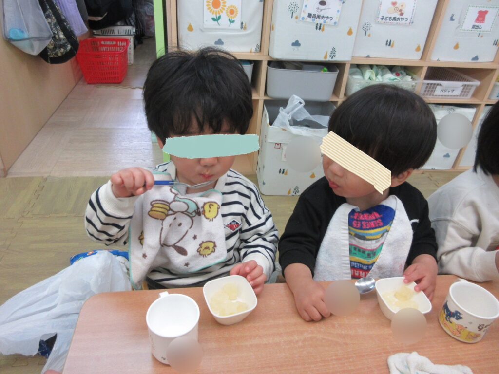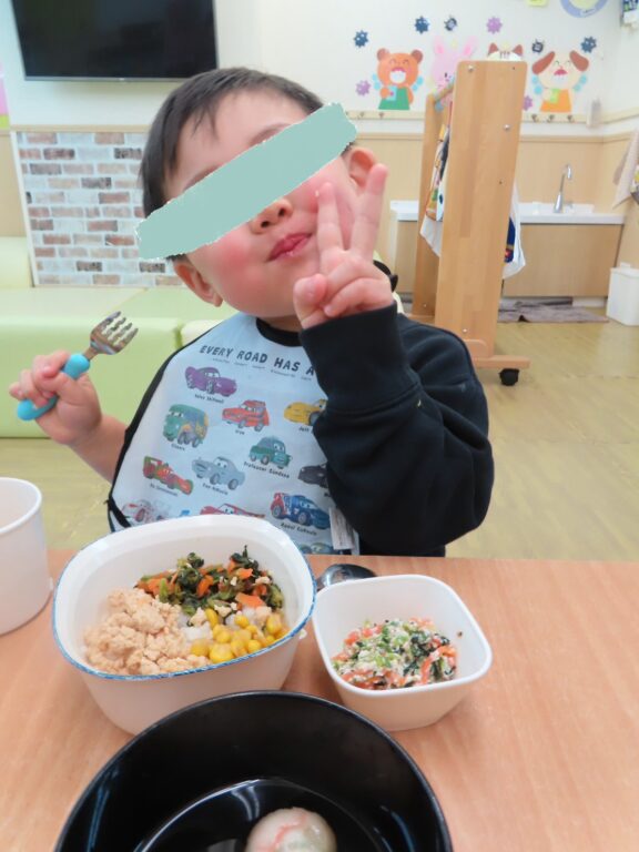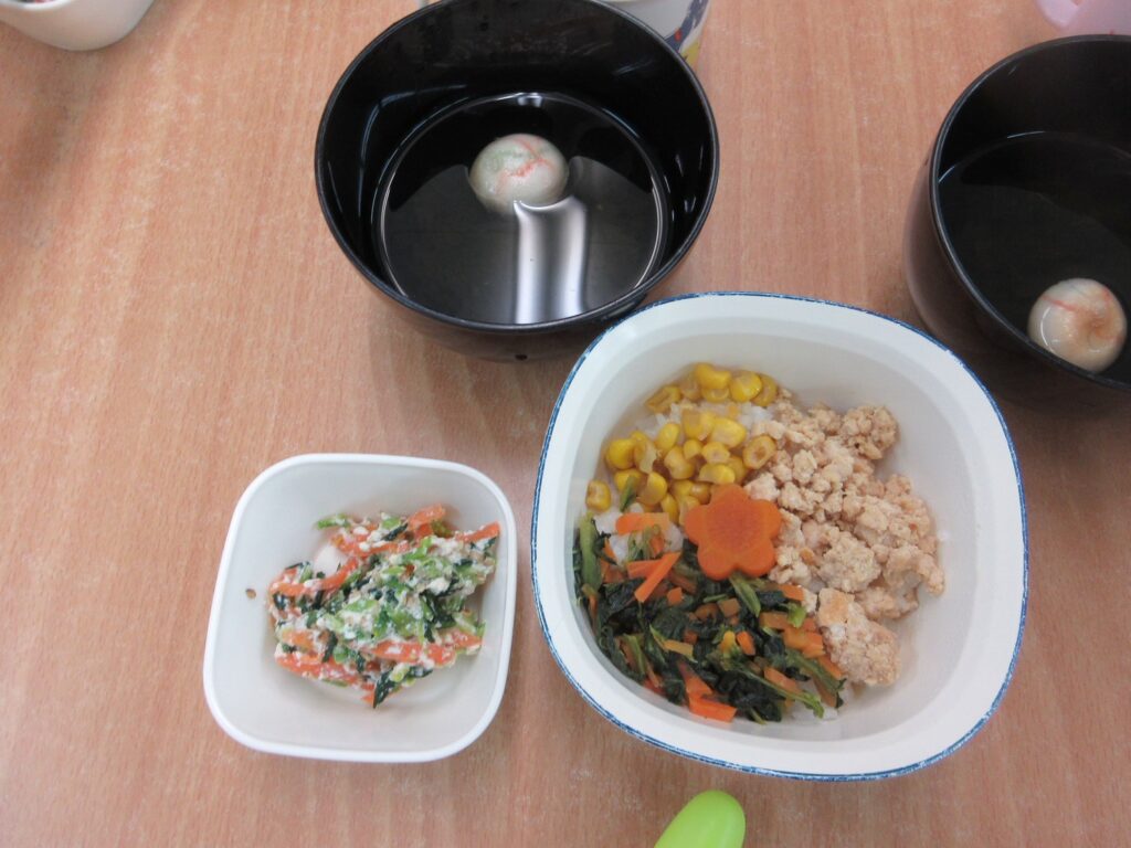 給食もひなまつりの行事食メニューでした🌷彩り綺麗な三色どんぶりにおつゆの中にはころんと可愛い手毬ふも入っていましたよ💕おやつは桃のゼリーでみんなとっても美味しそうにパクパク食べていました😋これからも子供たちが元気にすくすく育ちますように😌🌸