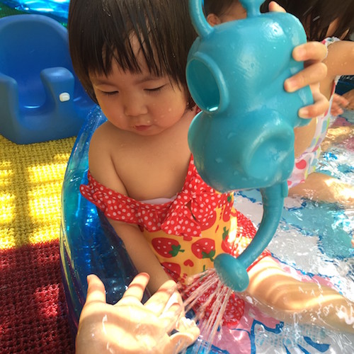 かわいい水着を着てみんなルンルン気分で「いち、に、さん、し、ご、ろく、しち、はち」と体操をしました?体調不良のお友達が多く、まだみんなでプールに入れていないので早く入りたいね〜〜?と、お話しながらプール遊びをたのしんでいました!!