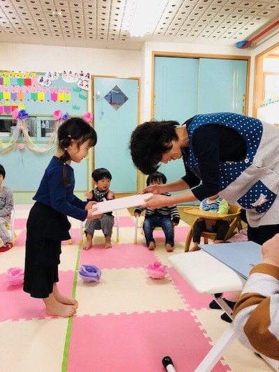 卒園式、おわかれ会では、きりん組さんが卒園証書を受け取り、みんなで思い出のアルバムを歌って、おわかれをしました💐