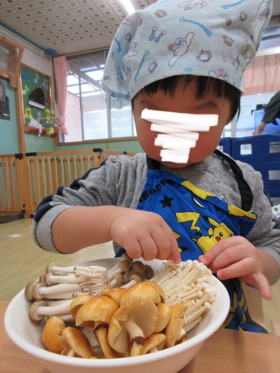 11月の食育活動では、季節の食材「きのこ」をテーマに、”しめじ・えのき・なめこ”に触れてみました。