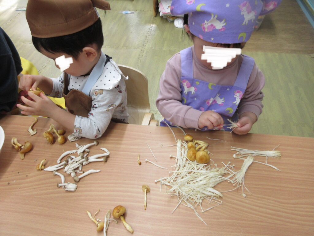 しめじとえのきは、実際に手🖐️でほぐし、さいてみたり、引っぱってみたりして感触を楽しみました。