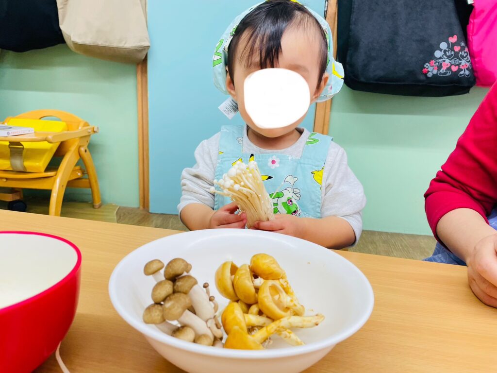自分たちが触ったきのこ🍄が入っていることを伝えると、「これさっきのや!」「たべる〜!」と、普段より積極的に食べる姿も見られました😋