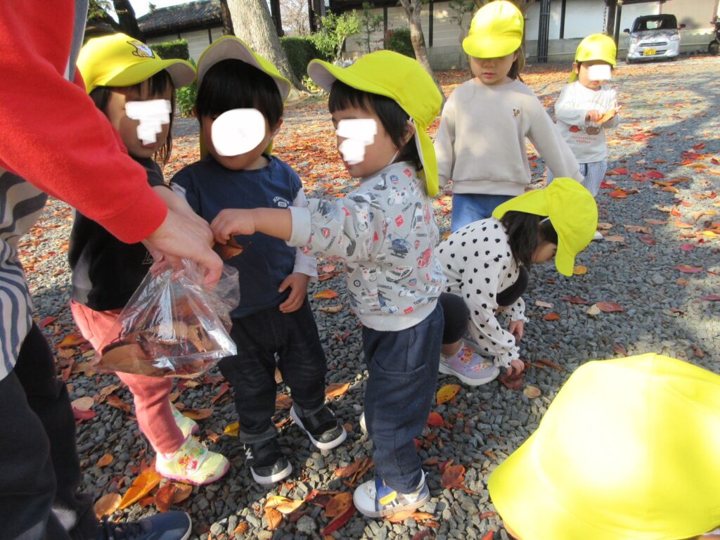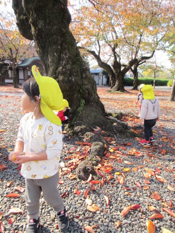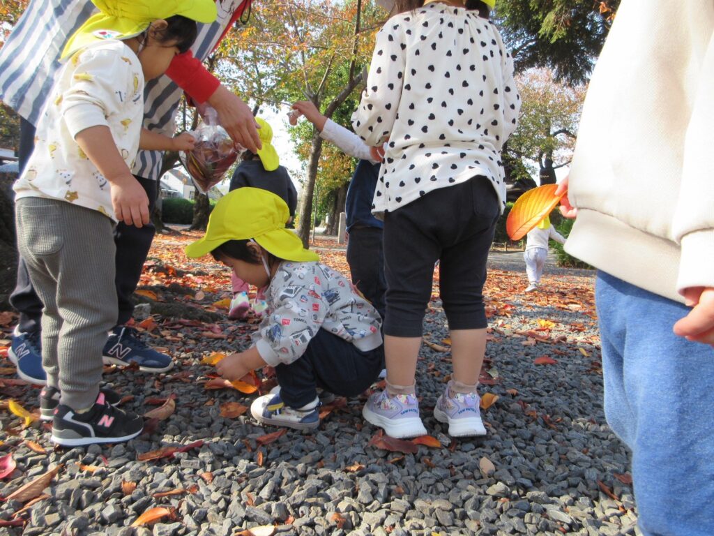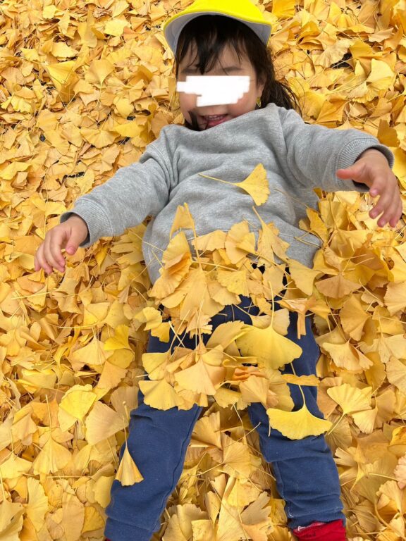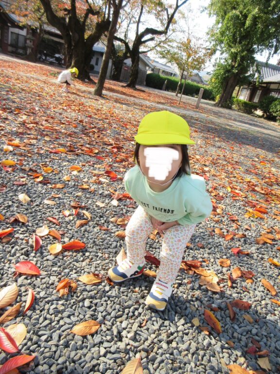 落ち葉の上にごろんと寝転んでみたり、手いっぱいに葉っぱを集めて「えいっ!」と葉っぱシャワーをしてみたり…秋ならではの遊びを楽しむ姿が見られました。