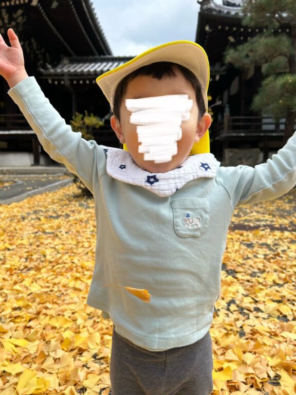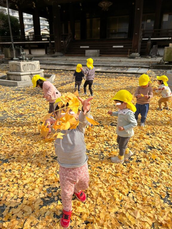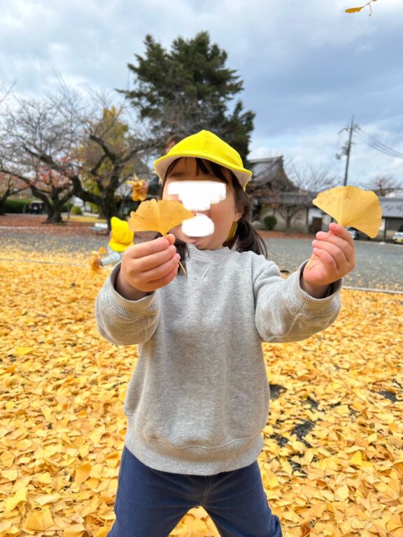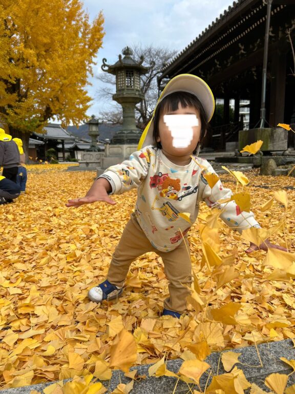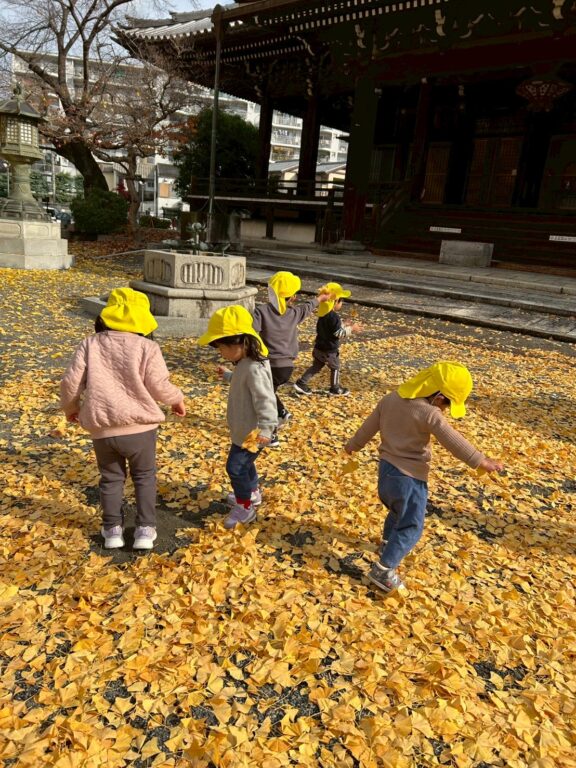 散歩道には赤や黄色に色づいた落ち葉🍂がたくさん。足元にはイチョウの葉のふかふかの絨毯が広がり、子どもたちは大喜びです🌈