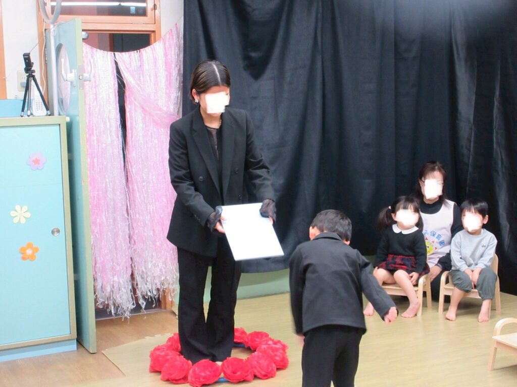 いつもと違う雰囲気に少し緊張した様子の子どもたちでしたが、名前を呼ばれると「はい!」と元気に返事、ポーズをして1人ひとりが卒園証書を受け取る姿には、これまでの成長が感じられ胸がいっぱいになりました🥹