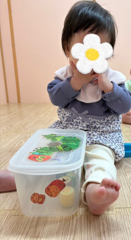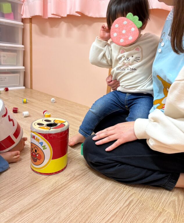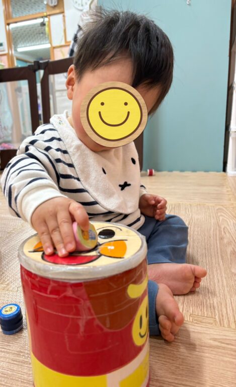 手作り玩具のぽっとん落としでは、丸い穴の中に一生懸命ペットボトルのフタを入れようと挑戦していました😆
