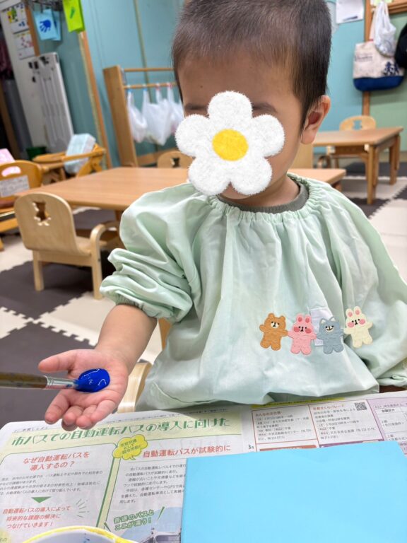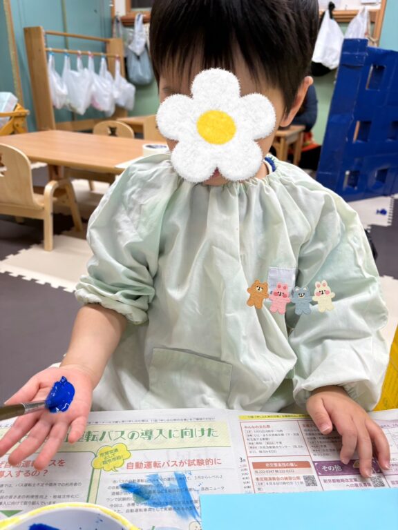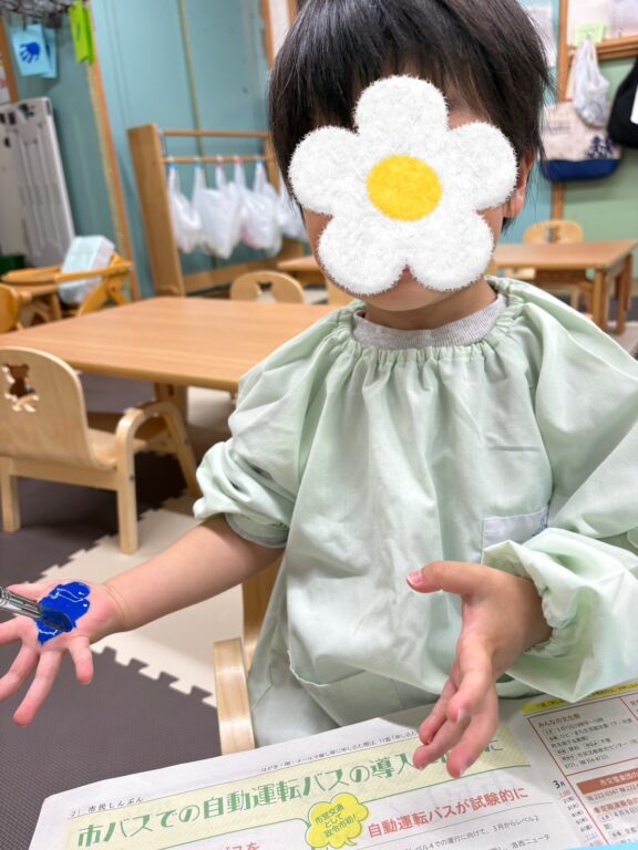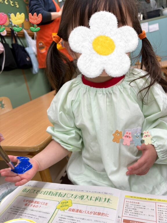 新入園児のお友だちは、初めての絵の具に少し緊張したのか、不思議そうにじーっと自分の手を眺めていましたよ😆